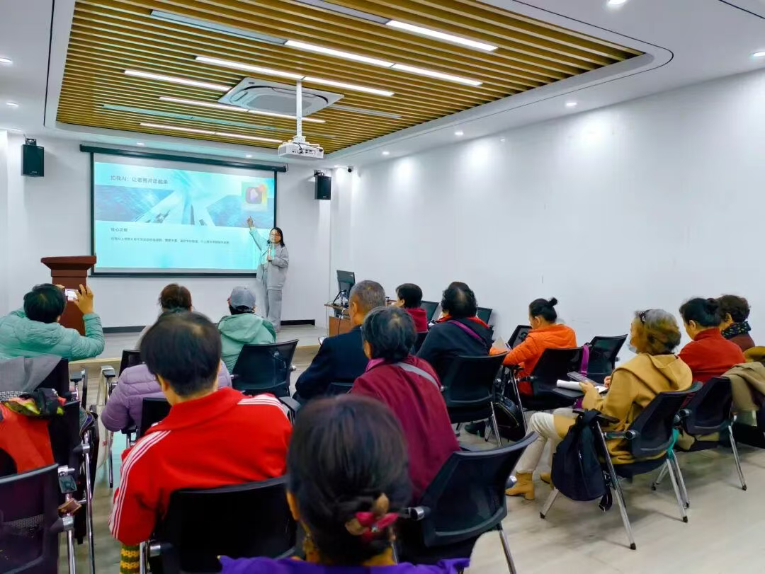 本次科普活动聚焦老年人实际需求,设置了两个部分内容丰富、循序渐进的AI应用教学。活动第一部分,授课老师用浅显易懂的语言,为社区老人揭开AI技术的神秘面纱。从写作、聊天的智能助手,到视觉创意的神奇应用,老师系统介绍了各类AI软件的特点和用途,让大家迅速掌握了AI语音助手、智能相册、AI健康监测APP等AI软件的核心操作。