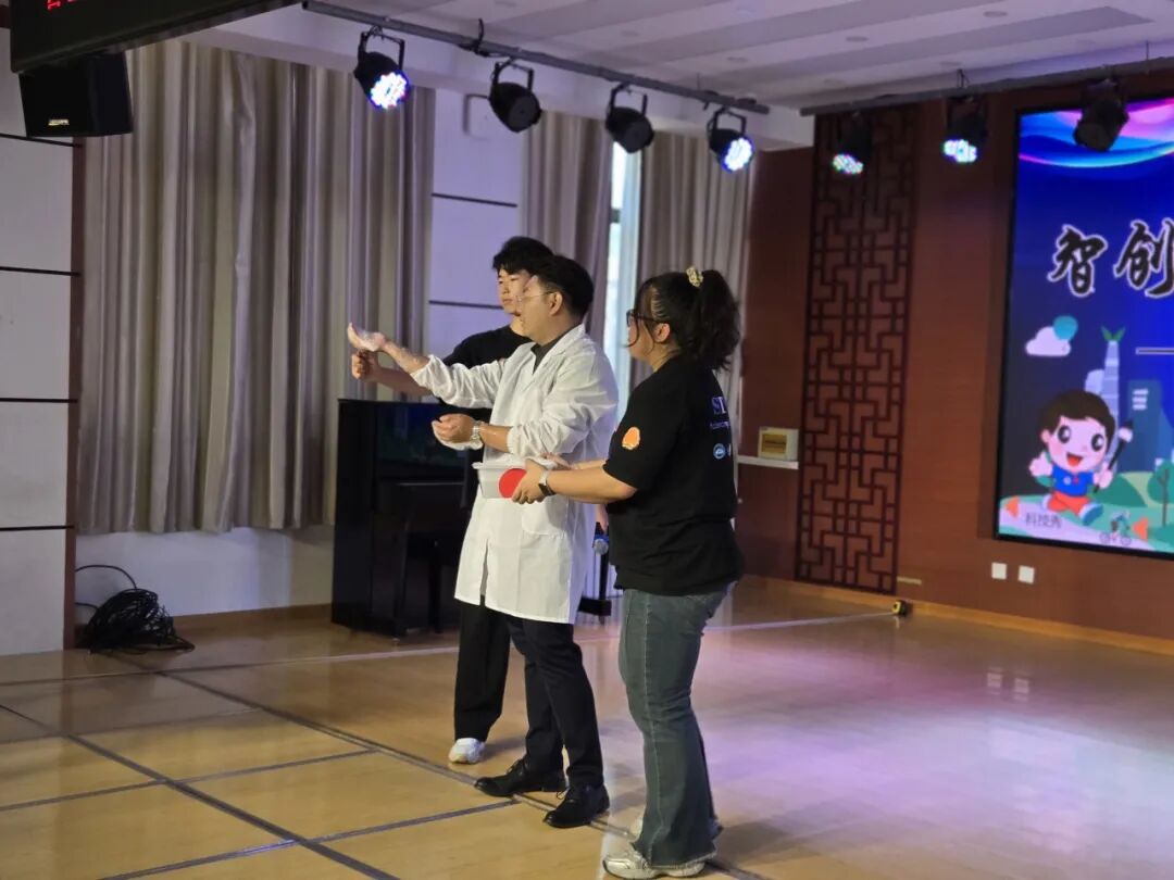 在“景小美科学SHOW”环节,三大硬核实验引爆全场:人体感应灯泡实验巧妙利用人体导电,指尖轻触即点亮科技之光;马德堡半球实验通过铜球真空演示大气压的惊人力量,重现17世纪经典;火焰掌实验中,丁烷气在水膜保护下腾起火焰,安全展现燃烧奥秘;学生们在惊叹中领悟科学原理,更在互动中点燃探索热情,让“天马行空”的创意落地生根。