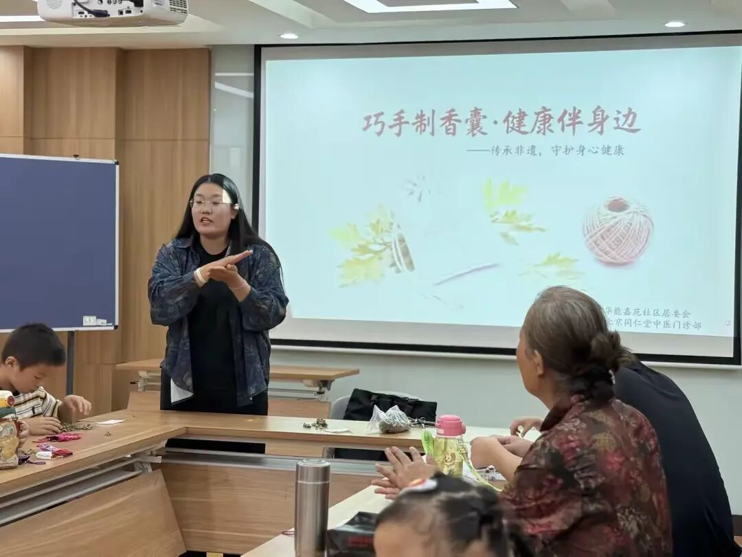 活动伊始,授课老师用通俗语言讲解香囊文化,展示艾叶、薄荷等温和药材,针对老人助眠、儿童防蚊等需求的科普用法。大家认真聆听,现场互动频频。