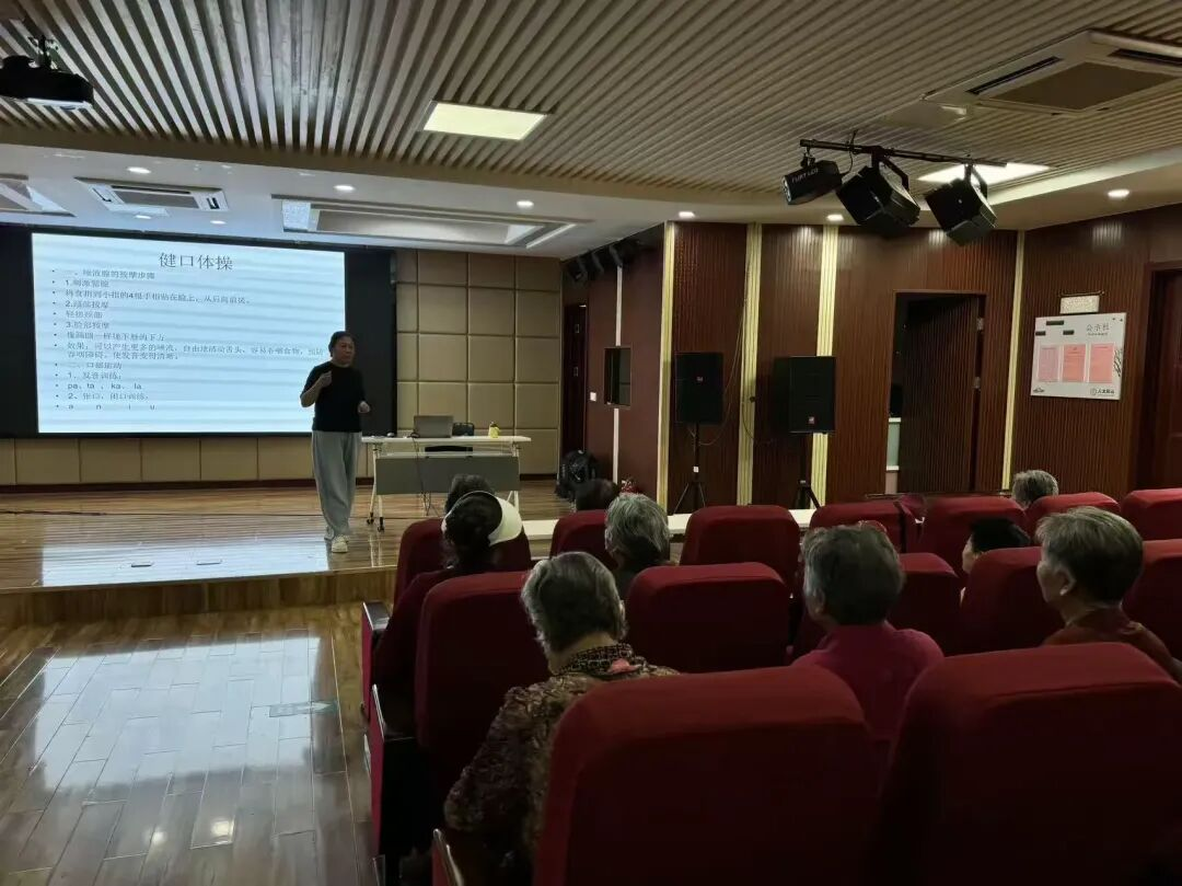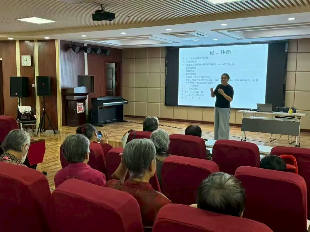 本次讲座以“健口体操”为切入点,通过“刺激腮腺-颈部按摩-脸部按摩-口部发音训练”四步法,现场示范如何通过简单动作激活口腔功能。针对大家提出的“按摩力度如何把握”“每天练习多久合适”等问题,授课老师逐一细致解答,让每个人都能准确掌握“健口体操”的要点。大家一边认真听讲,一边在手上比划练习,现场学习氛围十分浓厚。