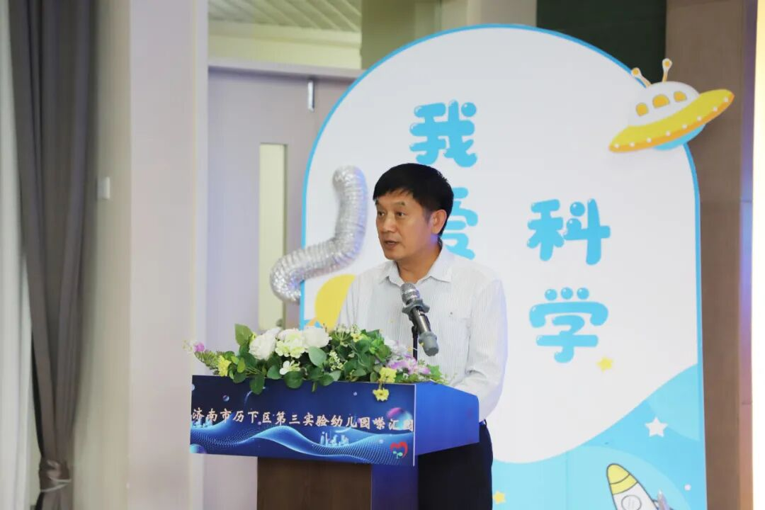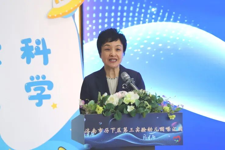 活动伊始,济南市历下区第三实验幼教集团党支部书记、总园长王玫上台致词。王玫首先对大家的到来表示热烈欢迎,随后立足本园实际,分享历下三幼的科普教育发展历程,详细阐述本园将科普教育融入“真育·品质课程”,并创新打造“四悦科普阵地”的实践路径,以鲜活案例生动诠释了我园“做真教育 育真儿童”的育人理念。